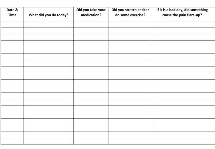 Self-monitoring helps you take control of your pain. Think of it as learning the basics of your pain so you know it and how to manage it better. Start a daily journal of your pain to monitor how your pain reacts to different activities and what makes it better or worse. It will also help you when you see your healthcare professional as they will get a better picture of your pain and what makes it better/worse.